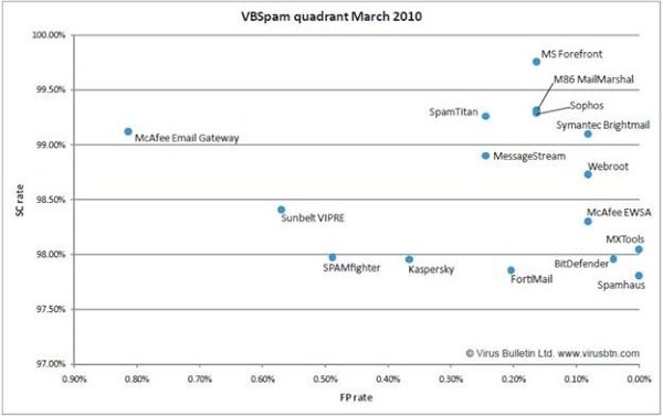 According to Virus Bulletin, ForeFront Protection for Exchange is the best antispam solution with a blocking rate at 99,86%.