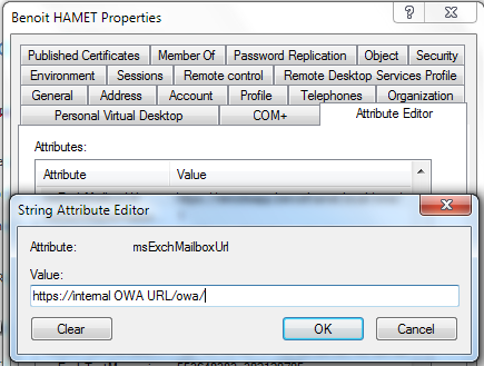Then locate the msExchMailBoxUrl attribute and update his value with your Exchange access server (‘front-end’); use the internal URL, SharePoint is very intelligent and, if your AAM are correctly configured, will switch the URL in case of remote access.