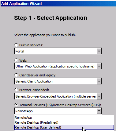 Then choose Remote Desktop (User defined), available at Terminal Services section.