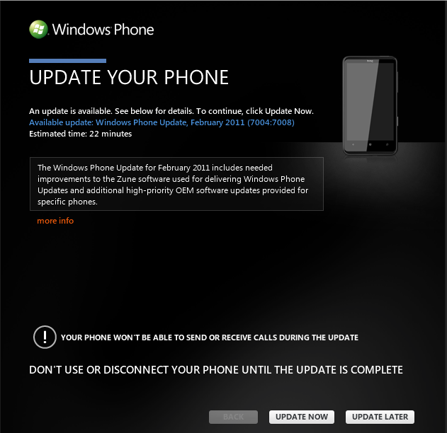 After receiving the update availability notification on your Windows Phone, connect your phone to you computer and launch the Zune software (if not started automatically).