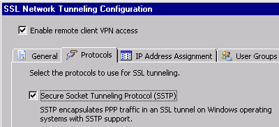 1.4 To allow the use of SSTP, tick the check box on the Protocols tab; this will allow end user to manually create a VPN connection (using SSTP)