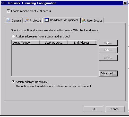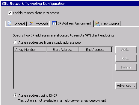 - DHCP can not be used with SSL Network Tunneling for providing IP configuration to remote client; you have to define a static pool as well as the IP configuration (DNS, gateway) – of course, this doesn’t change anything when UAG is working within an array