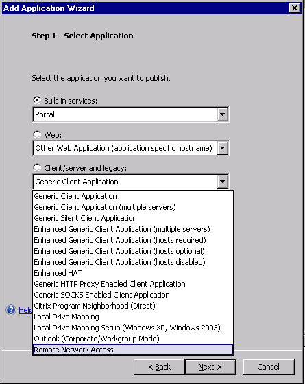 2.1 Still on the UAG management console, browse to your HTTPS trunk (the one defined during step 1.3) and add an application to the portal and select Client/Server and legacy – Network Access