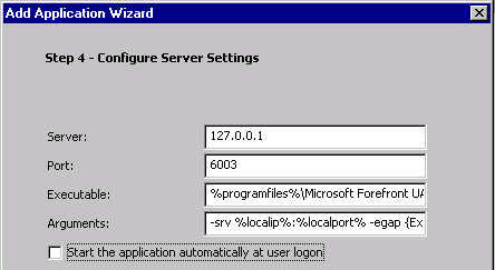 Don’t modify the settings shown during the step 4 (Configure server settings); except if you want to start the connection when the user logon on