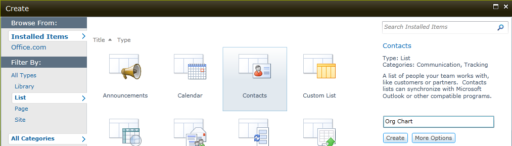 Connect to your SharePoint site and create a Contact list. I don’t do any customization on this list ‘(ie adding/deleting field) but you can do for matching your need.