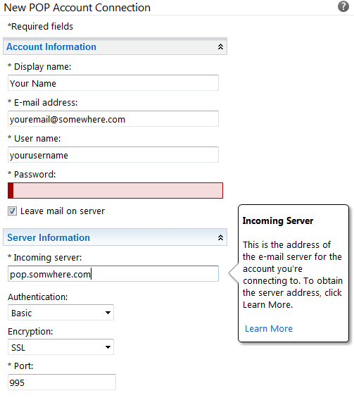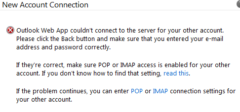 If the system is unable to connect to this email, you can enter manually the POP / IMAP connection settings by clicking on the POP link or IMAP link, depending of the connection type to use