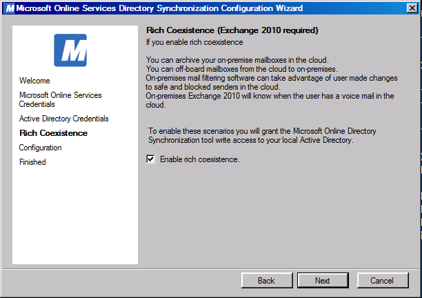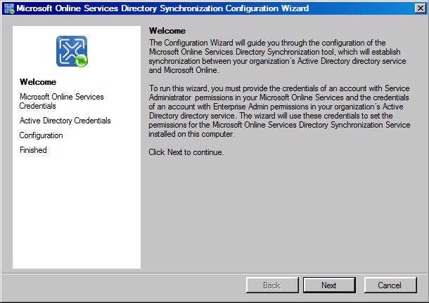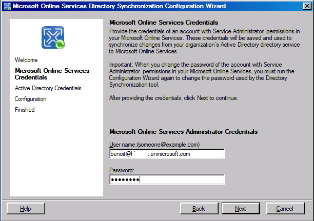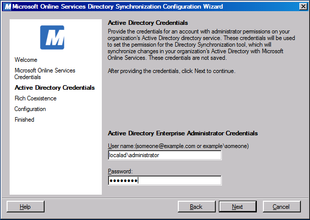 During the synchronization configuration, you will need to provide your Office 365 credentials for your tenant as well as AD credentials. Please note that the AD account used must be Enterprise Administrator