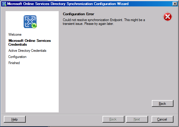 1. In case you downloaded and installed wrong DirSync tool, you will have an error (Could not resolve synchronization endpoint) when trying to initiate the synchronization with Office 365.