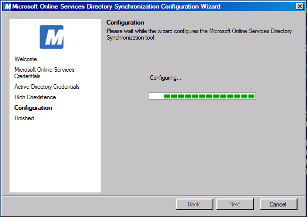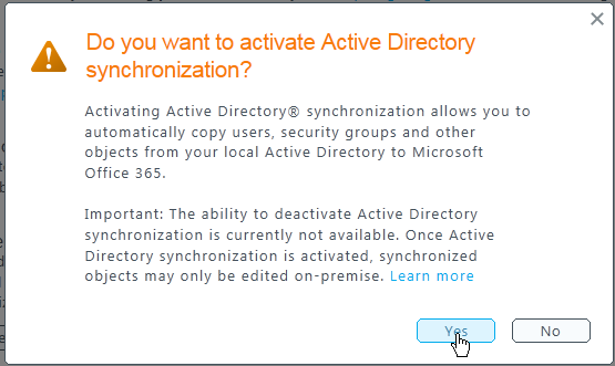 Confirm the activation; this warning reminds you that DirSync can’t be disable after