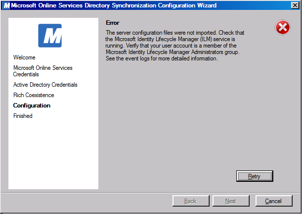 2. If you have an error like this one: “The server configuration files were not imported. Check that the Microsoft Identity Lifecycle Manager (ILM) service is running.