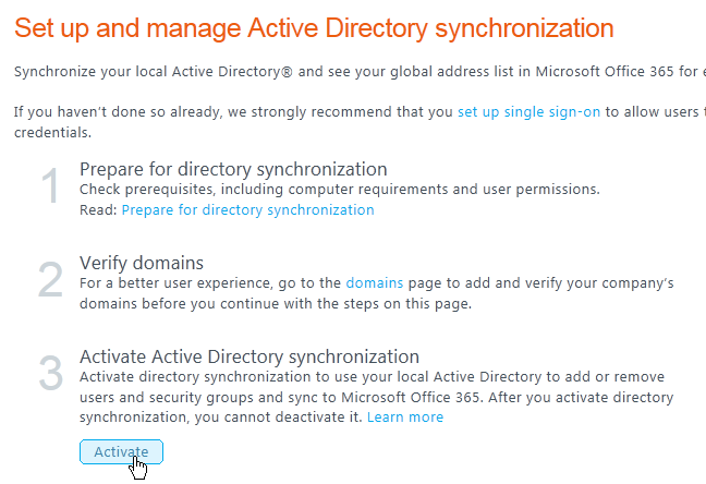 Then, click on Set up link available on the right of Active Directory Synchronization