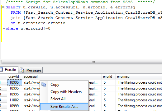 join [<your search crawl store database>].[dbo].[MSSCrawlErrorList] e