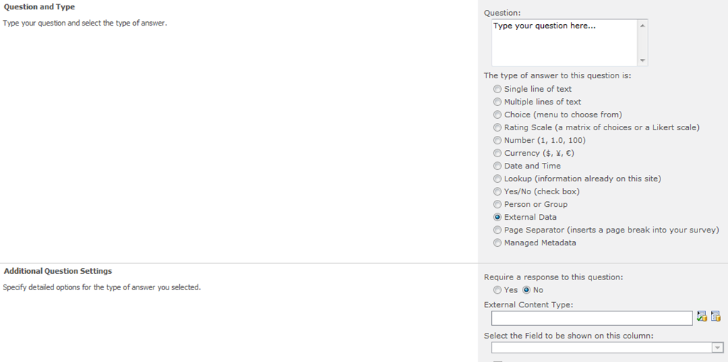 - Then define a question and choose External data as question type but don’t define External content type