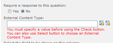 - Then, and this is now where is the bug, if you click on Next Question you will have an error message which said An unexpected error occurred. But if you click on Finish, you have a clear message which said you must fill the External Content Type field (You must specify a value before using the Check button. You can also use Select button to choose an External Content Type.)