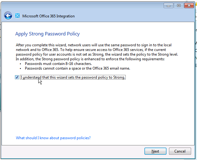 - Then the wizard is informing you that your password policy must be strong (lower/upper case, number…). In case of your current password policy doesn’t meet this policy, please update yours and inform your users