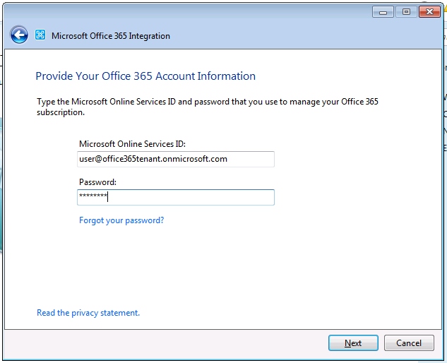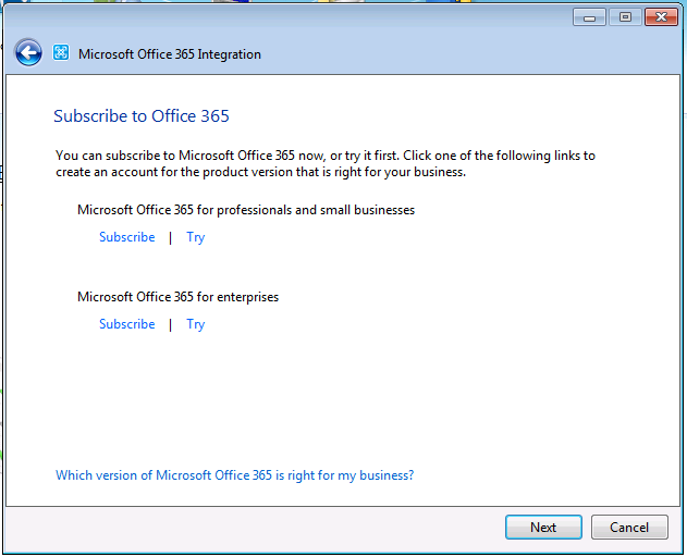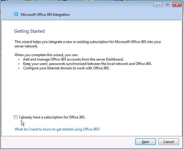 - Follow the wizard; note you can subscribe directly from this wizard to Office 365 or reuse an existing Office 365 subscription. If you don’t check the option “I already have a subscription Office 365”, you will have the option to subscribe to Office 365.