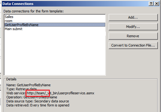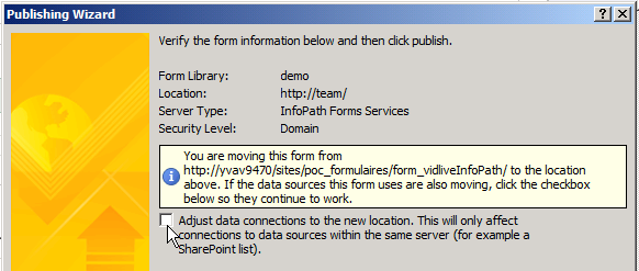 With InfoPath 2010, these updates are still mandatory BUT the form publication wizard detects the change and is asking to automatically update the data sources. In fact, all absolute URL’s are converted to match the destination URL – if you were using SharePoint lists as data source, only the first part is updated as shown in the screenshots below.
