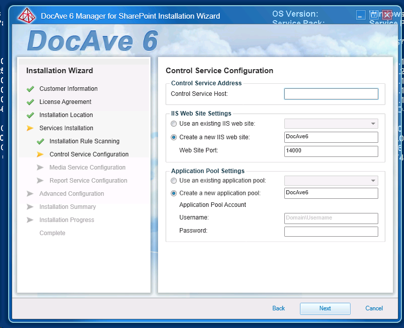 DocAve is using an IIS web site to be used so you have to define the settings for the new IIS site (server and communication) as well to create a new application pool. This will be used by the Control Service where DocAve agents will connect.