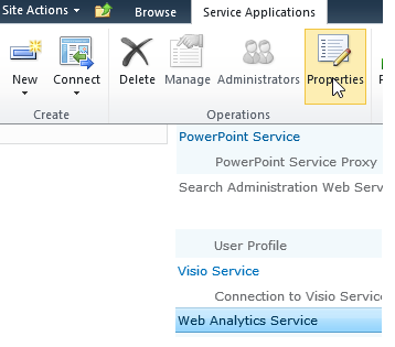 To solve this issue, go to the Service Application management from the Central Administration and select your Web Analytics service application and click on the Properties button shown on the ribbon