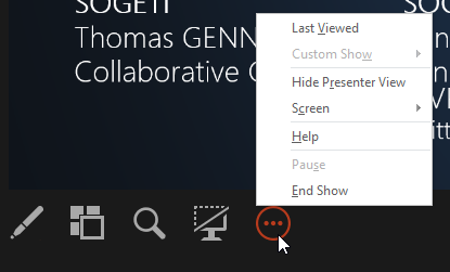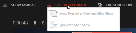 The presenter view menu allows you to end the slideshow (equivalent to Escape key), change the display settings or show the Windows taskbar.