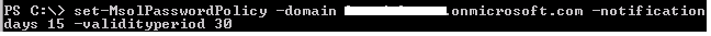 The following sample is settings password expiration to 30 days and notification period to 15 days set-msolpasswordpolicy -domain <your Office 365 tenant> -notificationdays 15 -validityperiod 30