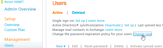 - Office 365 Administration Portal: at the Users Management section, a new section should be available to define these settings (NOTE: if this new section is not yet available throught your tenant administration portal, the CMDLet’s are working anyway)