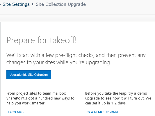 At this stage, you can start immediately the upgrade process (hit Upgrade this site collection) or perform a staged upgrade (Try a demo upgrade)