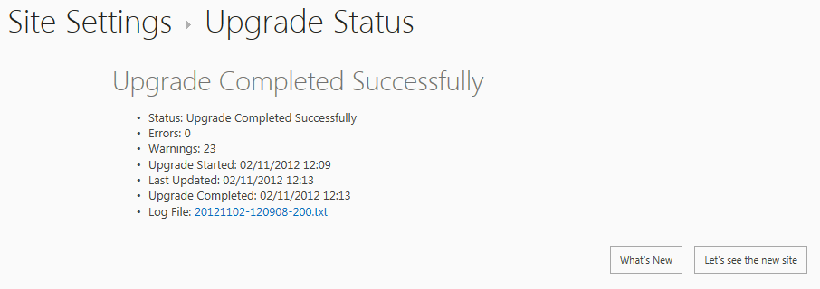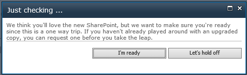 If you hit the Upgrade this site collection button you will be asked to confirm you are ready for upgrade: hitting I’m ready will start the upgrade process while hitting Let’s hold off will take you back to the upgrade page