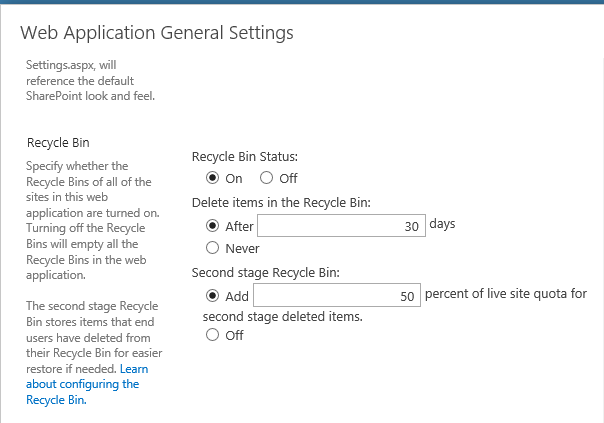As reminder, the Site Collection Recycle Bin is the recycle bin used to restore deleted items by end users once the retention delay has been reach (default is 30 days – you can manage this settings from the Central Administration\Manage Web Application\Web Application General Settings)