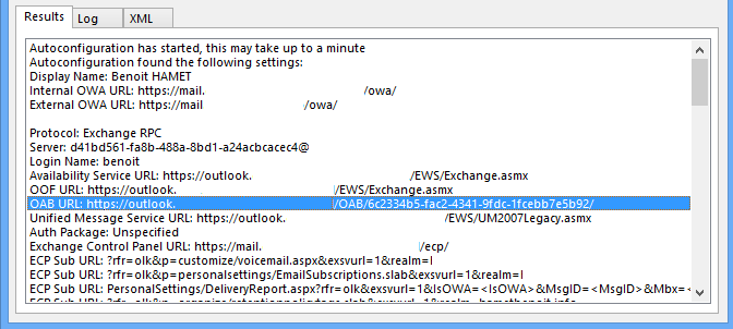 If you check autodiscover settings thanks to Test E-mail Autoconfiguration you may see no OAB URL defined – there is no URL neither no OAB parameter.