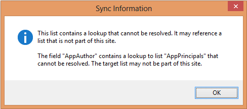 Following my post explaining how to synchronize a SharePoint 2013 with SharePoint Workspace (http://blog.hametbenoit.info/2012/11/06/sharepoint-use-sharepoint-workspace-with-sharepoint-2013/), you may experiment issue during the synchronization with error “The field “AppAuthor” contains a lookup to list “AppPrincipals” that cannot be resolved. The target list may not be part of this site”
