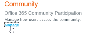 To manage this permission, connect to the Office 365 administration portal with a Global Administrator user account and define the Community parameter – located at the end of the page; default settings is ‘users are allowed to connect to Office 365 forums’.