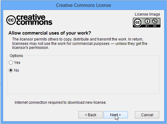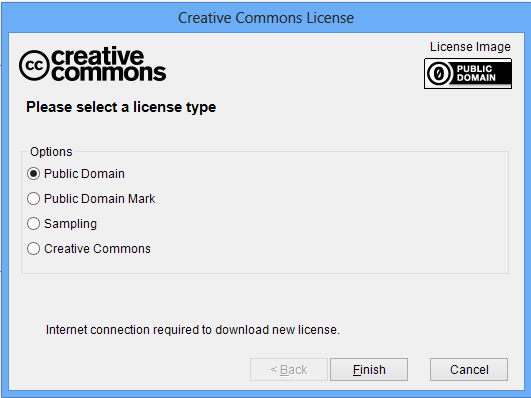 - Then follow the wizard to create your CC license; the last 2 options (Sampling and Creative Commons) will ask you additional details