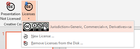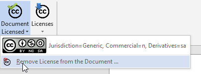 From this tab, you will be able to add all your Creative Common licenses you have created or create a new one; all license will be available for other Office application – if you create a new license with Word, this will be available also for Excel or PowerPoint
