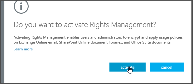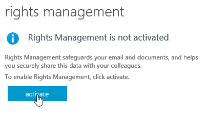 Once you have reached the Rights Management administration page, click on the Enable button and confirm the activation