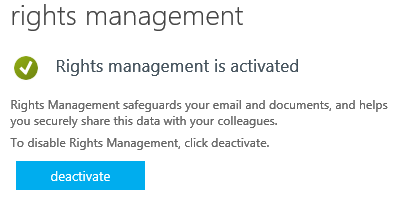 You are now redirected to the AADRM page which now is showing that RMS is activated; since this has been activated, you have the ability to disable it also from this page