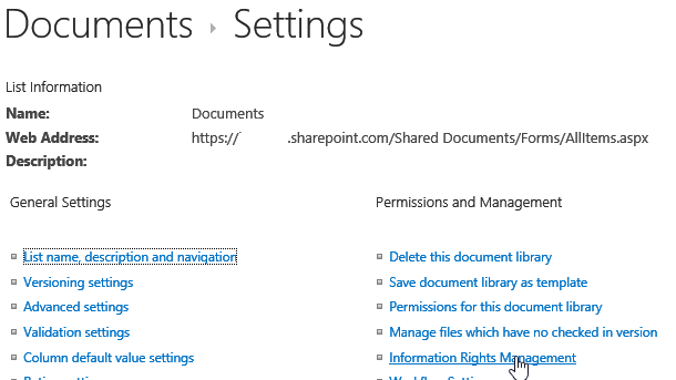 Finally, connect to your SharePoint site and browse to the document library you want to secure with RMS. Only ONE RMS policy can be applied on a document library.