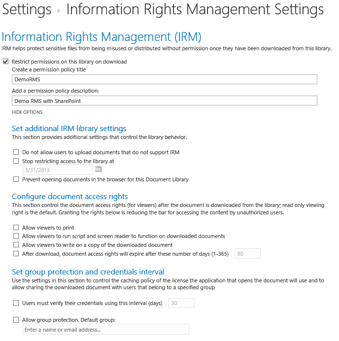 - Stop restricting access to the library: this means after the defined date, the document library will no longer apply the RMS policy