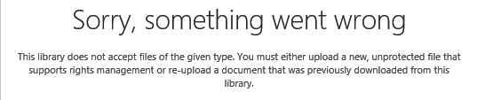 - Do not allow users to upload document that do not support IRM: this option will block document upload if the document format doesn’t support RMS