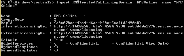 - Import-RMSTrustedPublishingDomain –RMSOnline –Name “RMS Online” ; this CMDlet is importing the new RMS parameters to your tenant