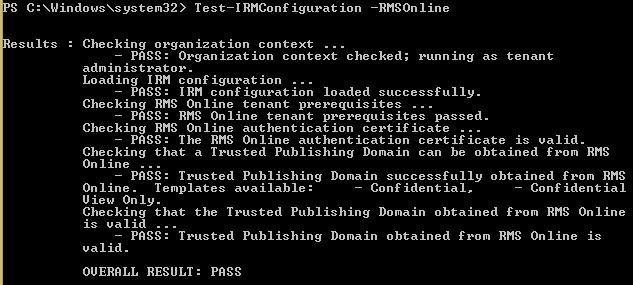 - Test-IRMConfiguration –RMSOnline ; this CMDlet is testing and validating the imported RMS configuration
