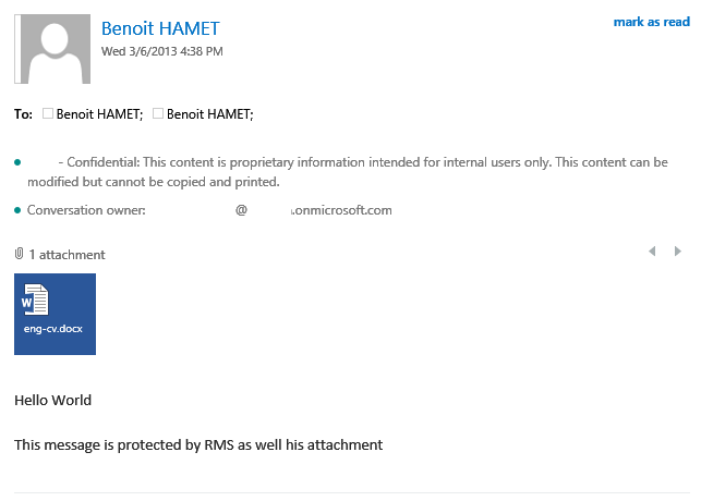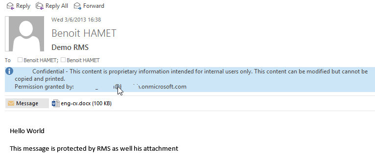 Message received and protected by RMS