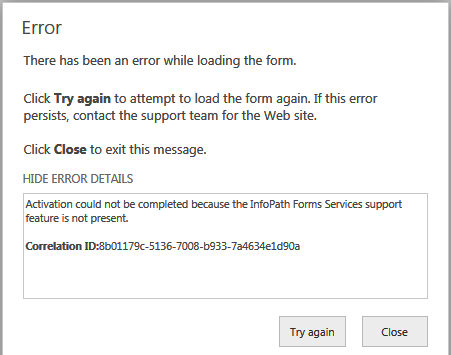 Activation could not be completed because the InfoPath Forms Services support feature is not present.