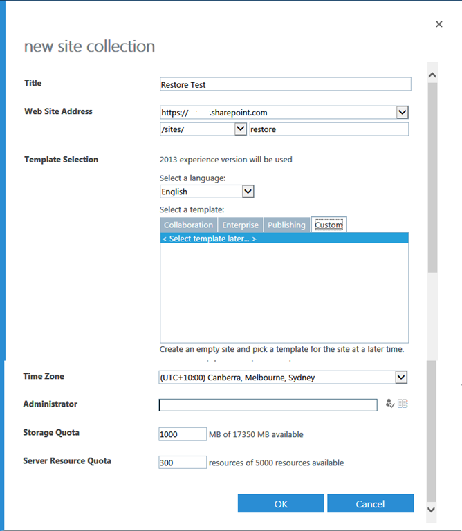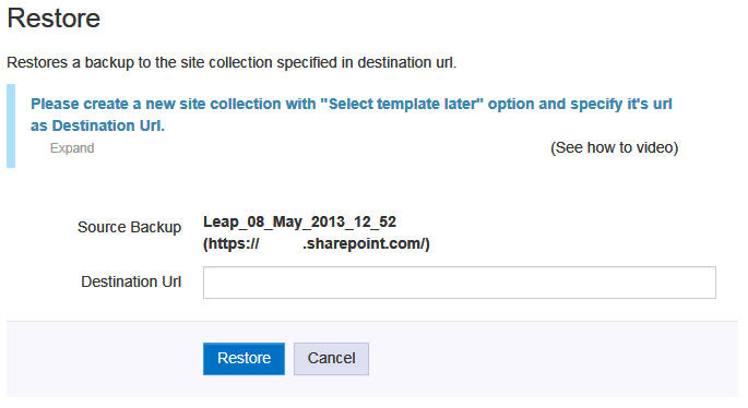 If you hit the Restore button, you will be asked for a destination URL; for this post, I created a new site collection with a new URL