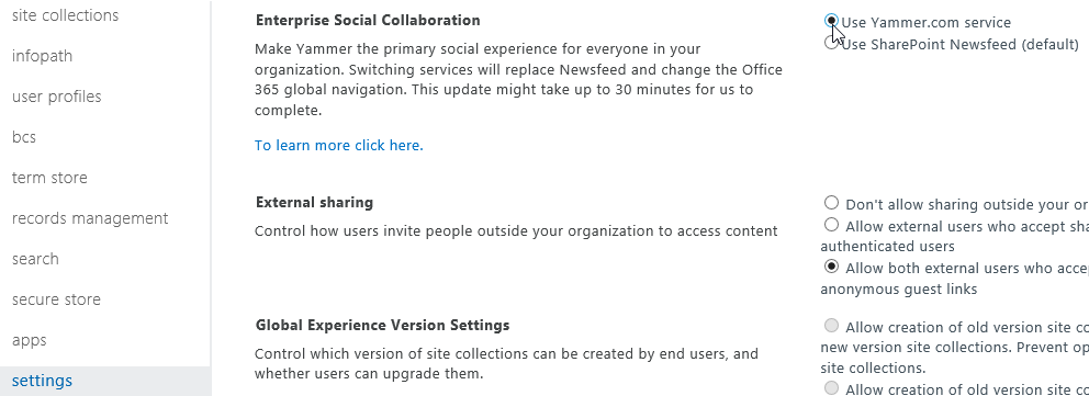 - Then go to the Settings option available on the left and choose Use Yammer.com service at the Enterprise Social Collaboration section on top of the page