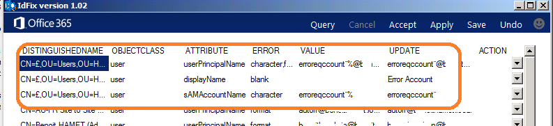 - Then the tool displays the Active Directory query and shows attributes which may be in error if/when synchronized with Office 365, as well the reason of the error