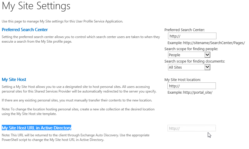 If you have already deployed and configured SharePoint 2013 – at least for evaluation, you may have seen a new settings on the User Profile service application – called My Site Host URL in Active Directory. This field is not writable and you may wonder how to configure and manage this field.