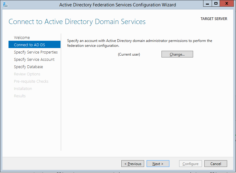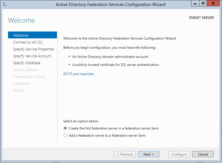 - As this server is the first ADFS server, I’m choosing Create the first federation server; off course if you already have ADFS server deployed on Windows Server 2012 R2 – always use the same version of ADFS across an ADFS farm, choose the second option Add federation to a federation farm