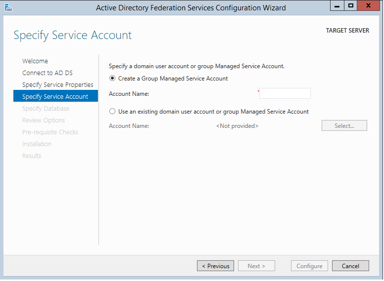 - Define the managed service account to use for running ADFS – you can choose an existing one or create a new one. In my case, I already created an MSA with the PowerShell command below; you may want to create manually the managed service account, if so open a Windows PowerShell windows (always run as administrator) and execute the following commands