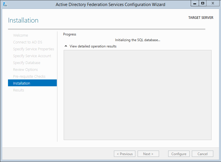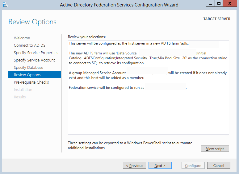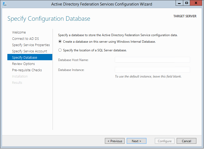 - Then define the SQL instance to use; local with Windows Internal Database or a SQL Server. In my case I’ll use an existing SQL; for more information regarding using or not using WID for ADFS see http://technet.microsoft.com/en-us/library/gg982489.aspx